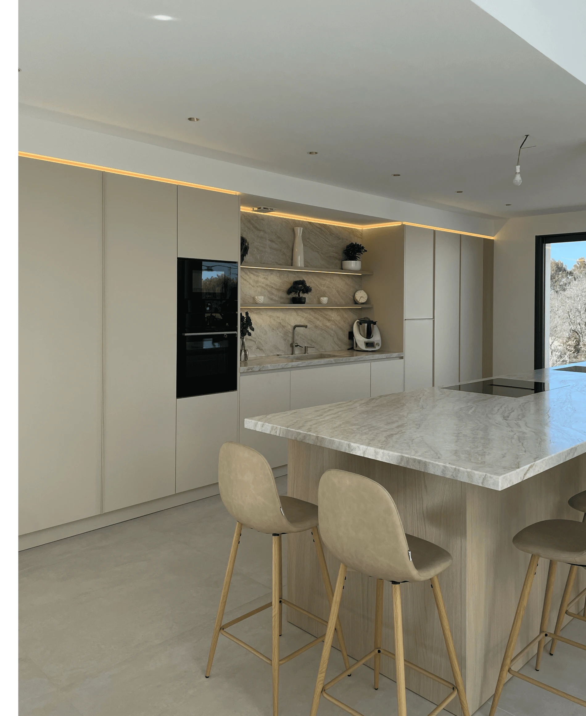 Les façades crème texturado Nigu apportent une douceur subtile, mises en valeur par des touches de chêne blanchi présentes sur les bords du linéaire, les étagères et les trois faces extérieures de l’îlot.