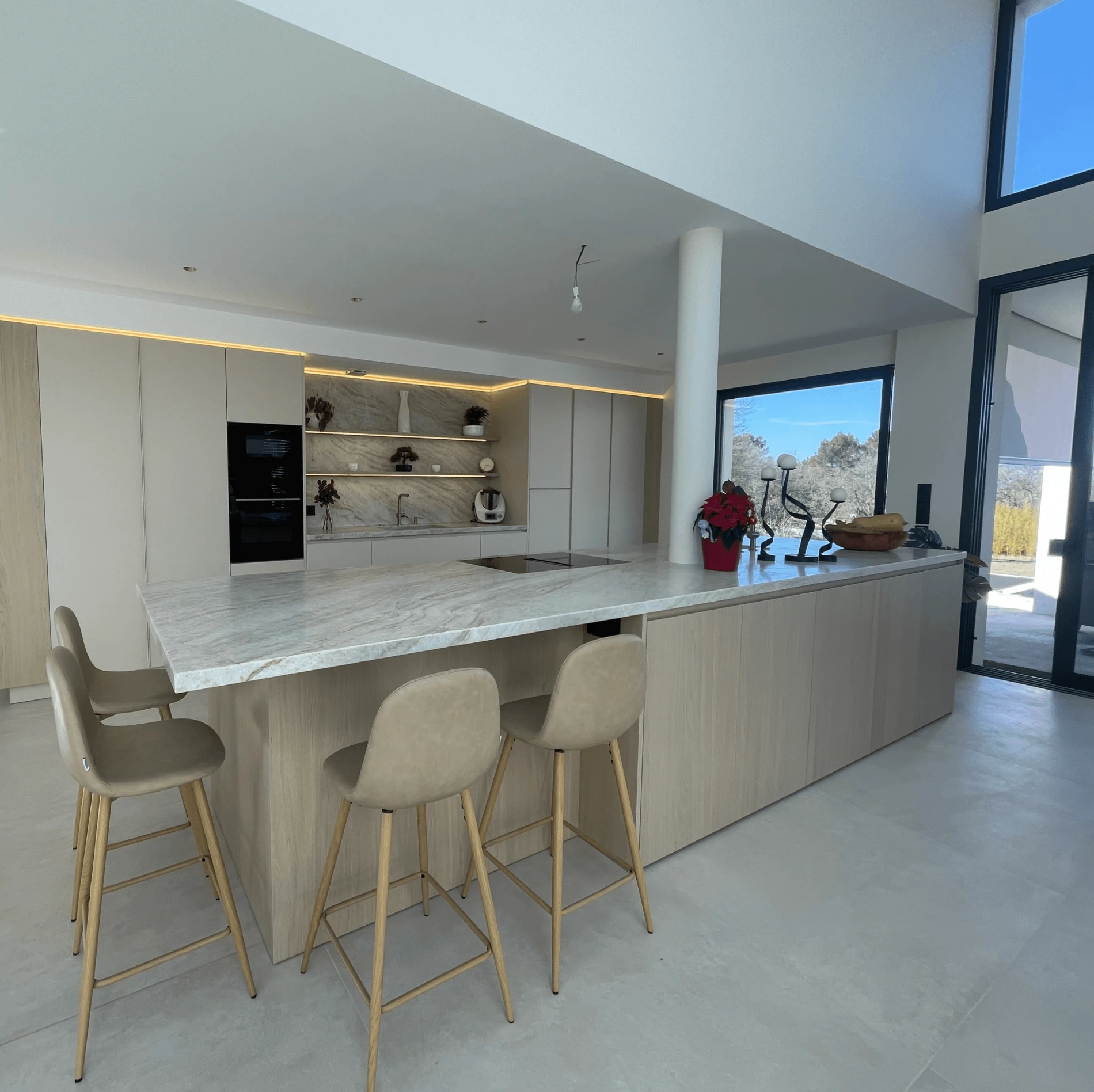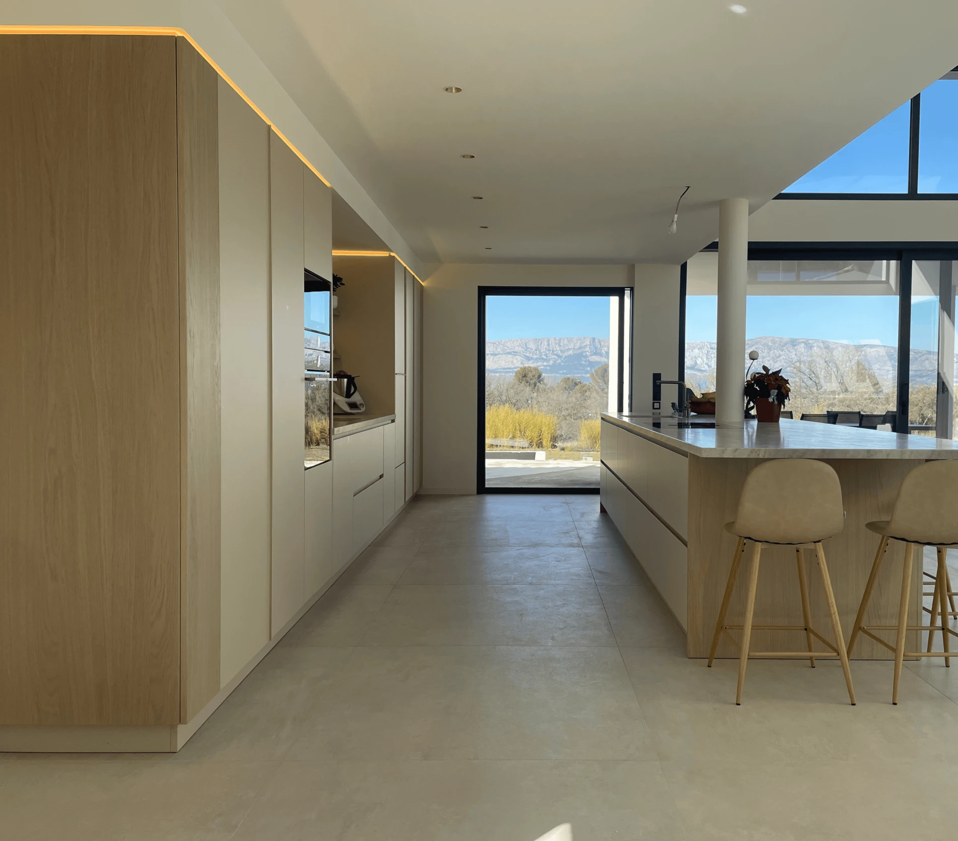 Sa composition associe un linéaire fonctionnel, un îlot central qui structure l’ensemble et un espace de colonnes qui prolonge la perspective.