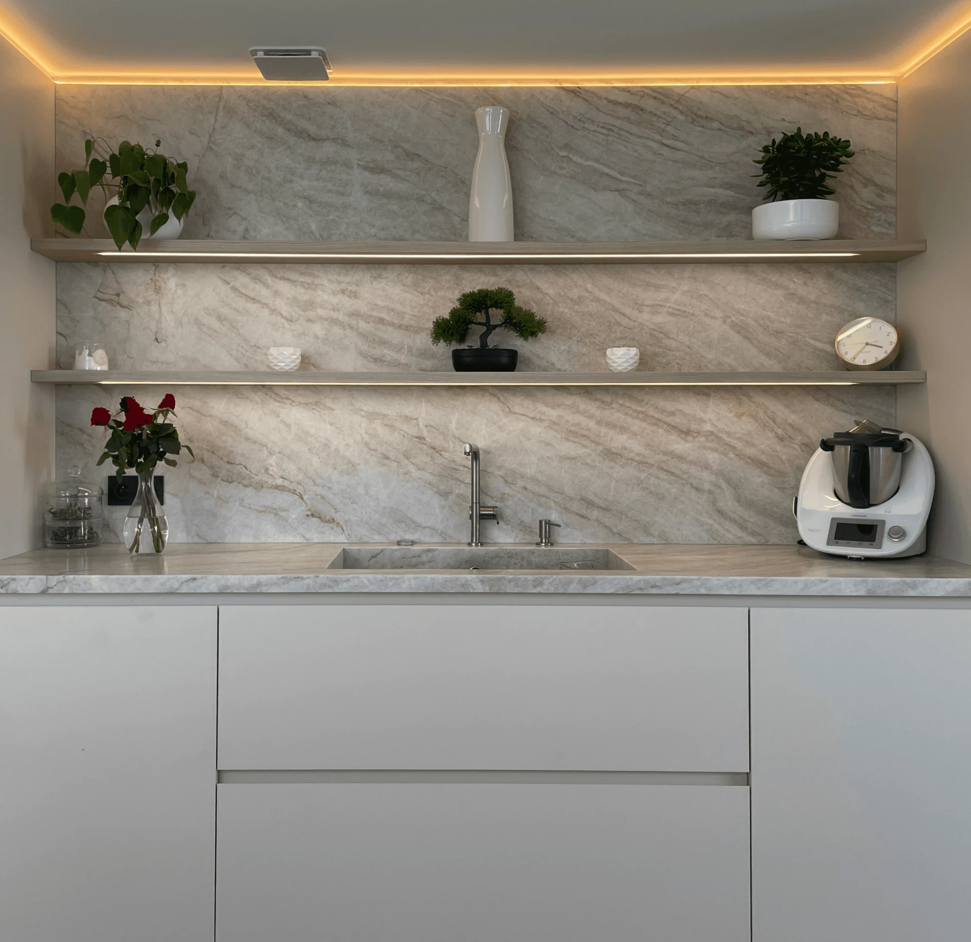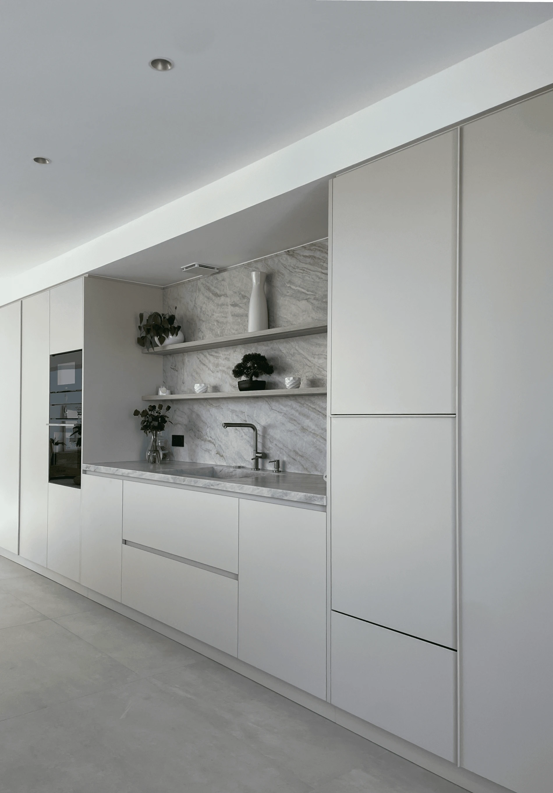 La composition joue entre clarté et contraste, solidité et légèreté, pour donner naissance à une cuisine où l’esthétique et le quotidien se rencontrent avec naturel.