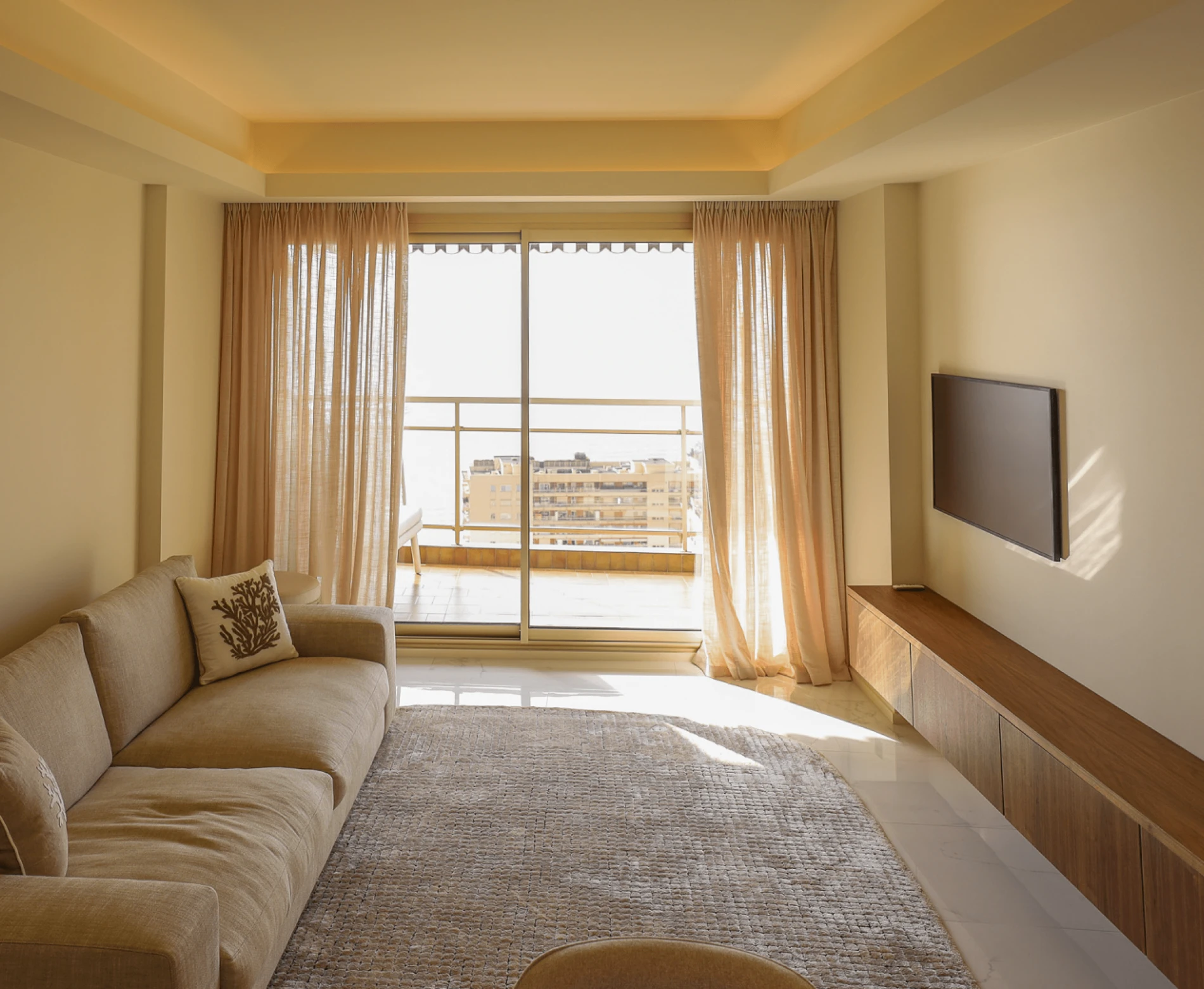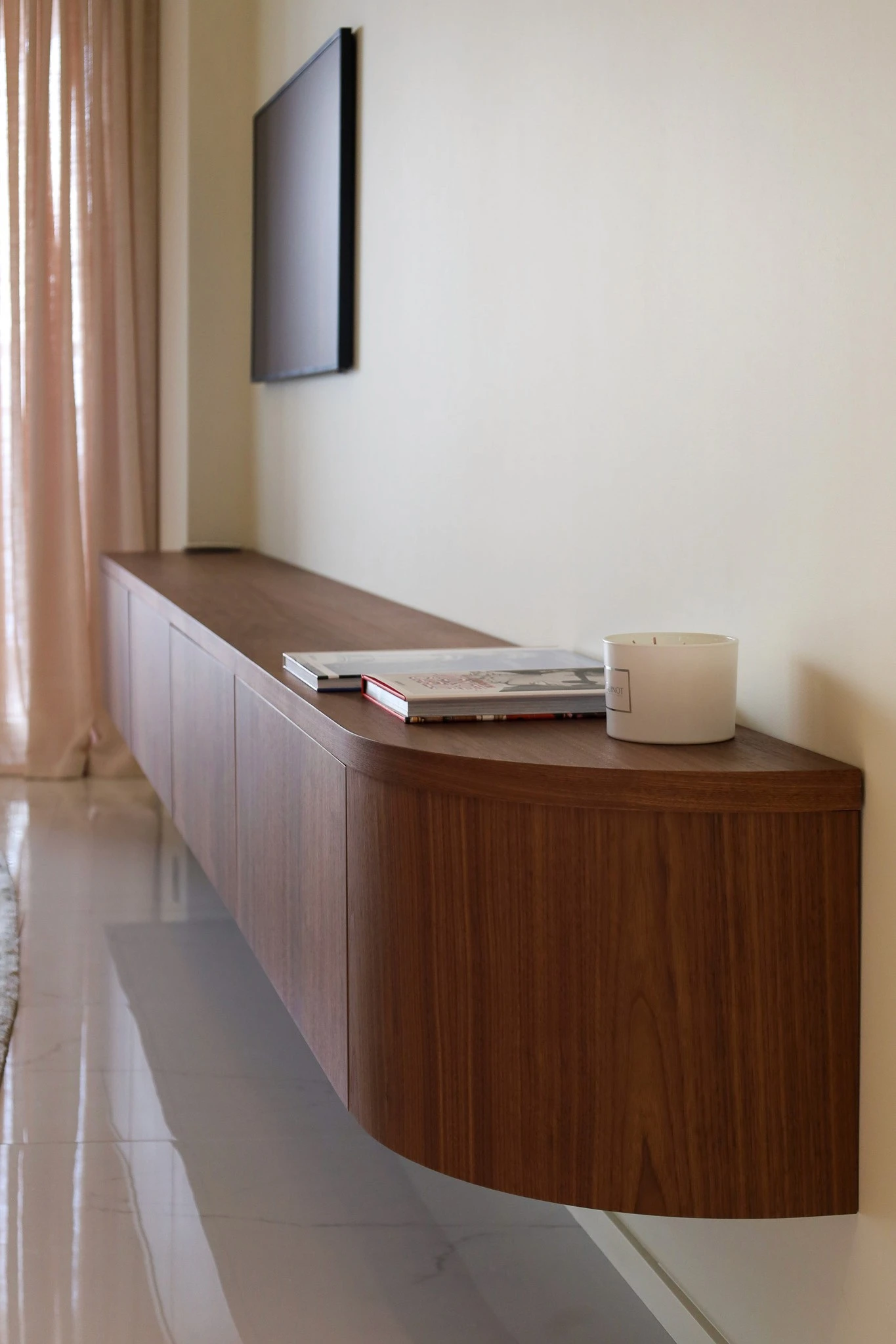 Dans le salon, un meuble TV en bois suspendu s’étire avec légèreté le long du mur. Ses lignes épurées et ses angles adoucis structurent l’espace avec discrétion, apportant au séjour un juste équilibre entre confort et design.