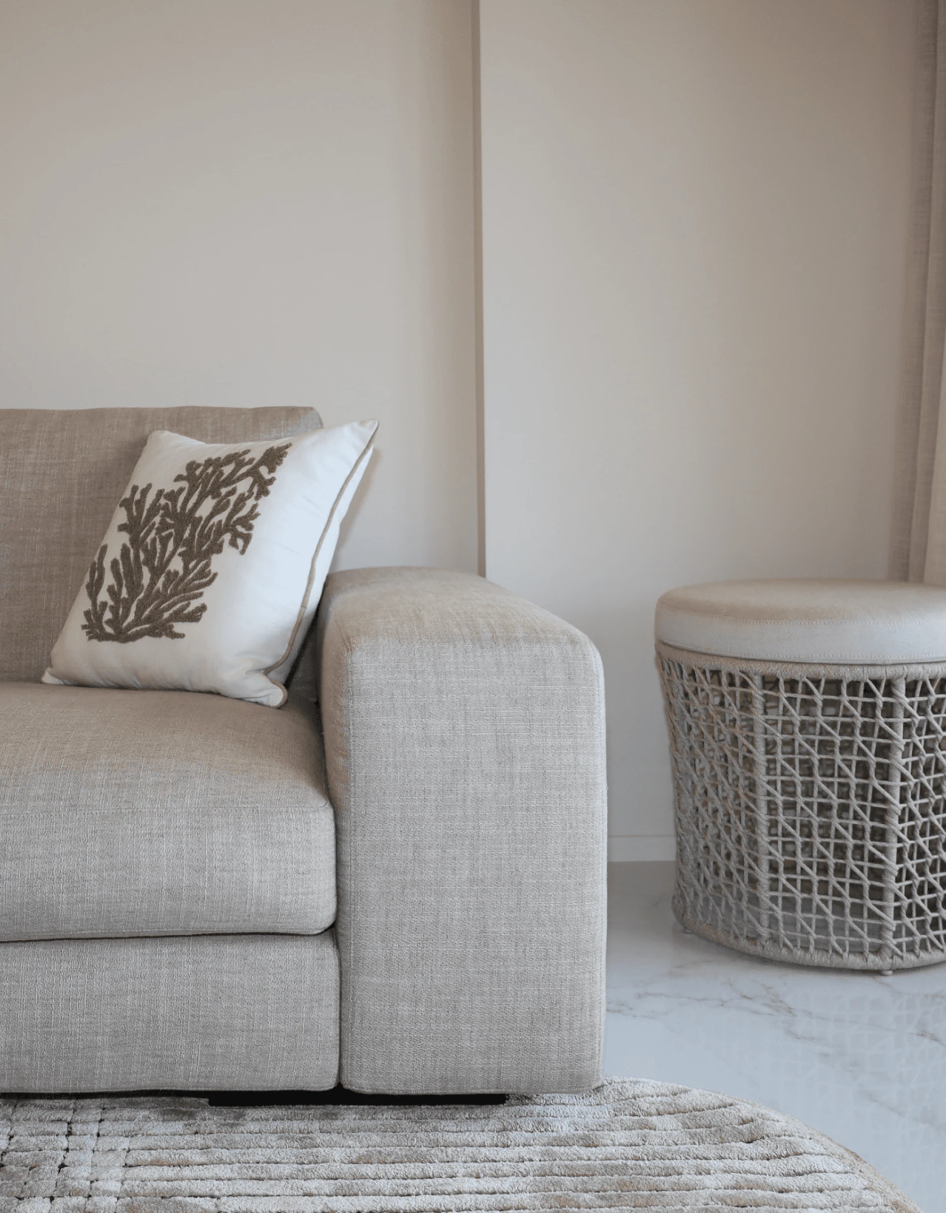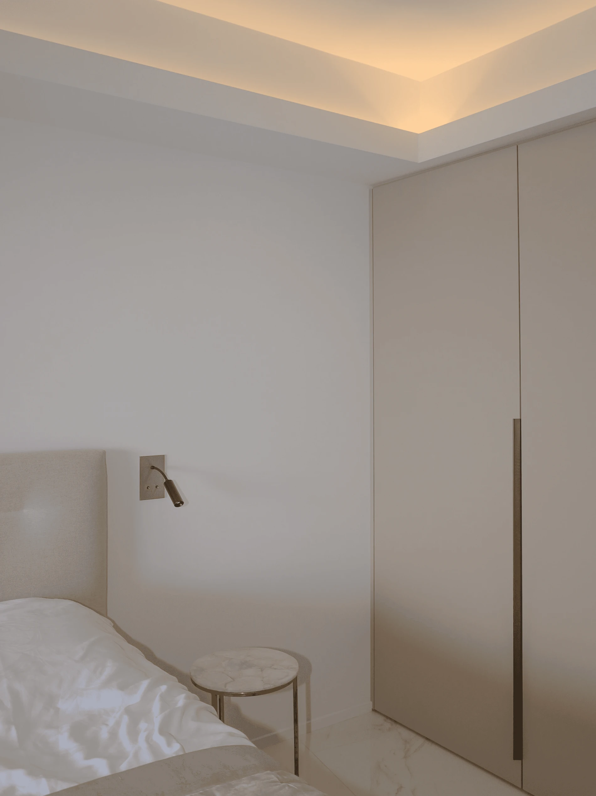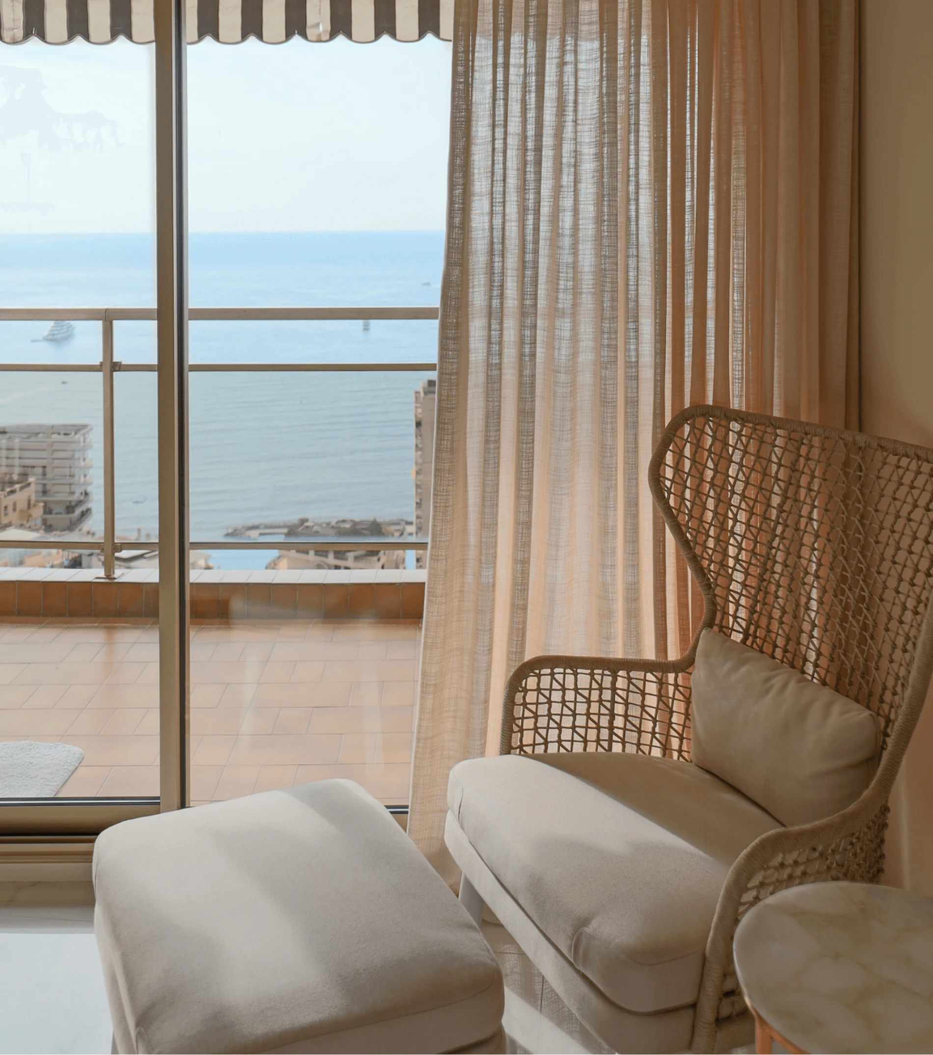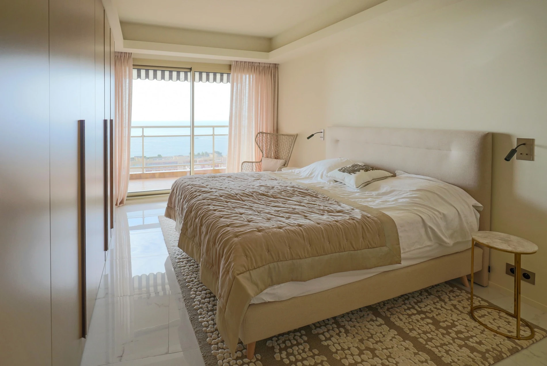 Dans la continuité de la cuisine, la chambre master mise sur la simplicité et l’élégance. Face à la mer, le lit devient un refuge lumineux, accompagné de lampes discrètes. Un dressing épuré occupe tout un mur, complété par un second plus discret. Quelques pièces choisies table d’appoint en marbre, fauteuil tressé, rideaux doux suffisent à donner à cet espace l’allure d’une suite sur-mesure.