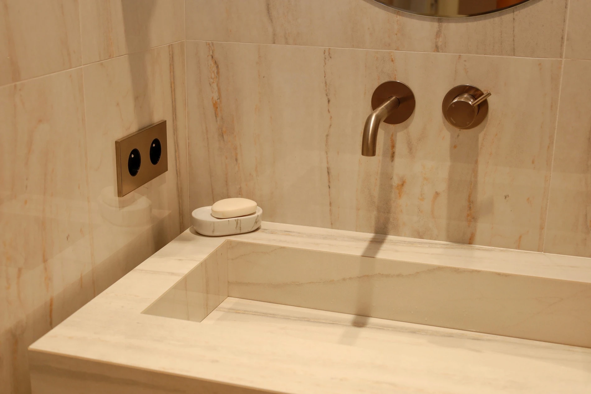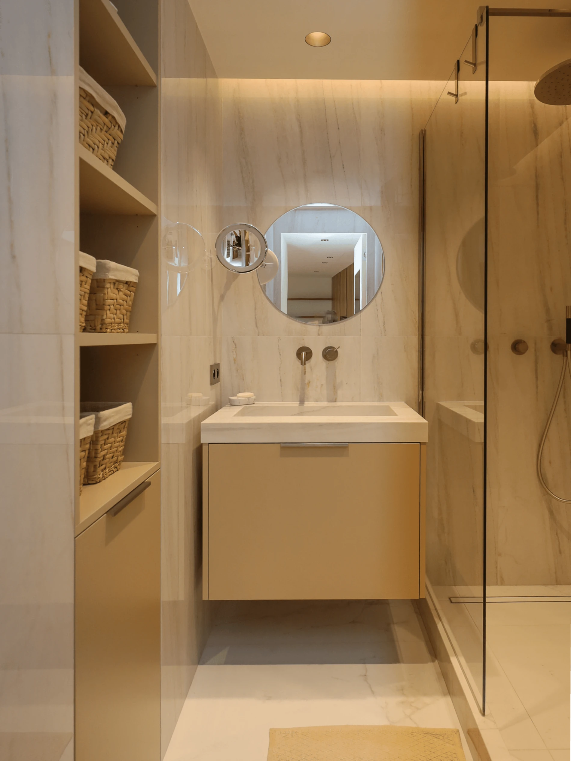 La salle de bain se distingue par sa pureté et sa finesse. Lignes épurées, surfaces lumineuses et miroir rond créent un espace intime et raffiné, où chaque geste devient un moment de calme et de sophistication.