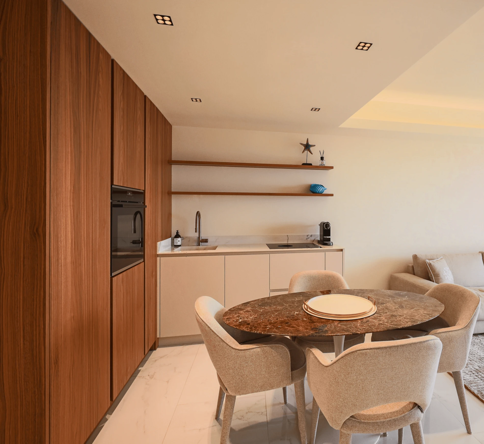 Une cuisine compacte et ouverte sur le salon, conçue sur-mesure pour optimiser chaque centimètre. Entre colonnes intégrant l’électroménager, rangements astucieux et matières naturelles, elle associe discrétion, confort et élégance dans un espace réduit.