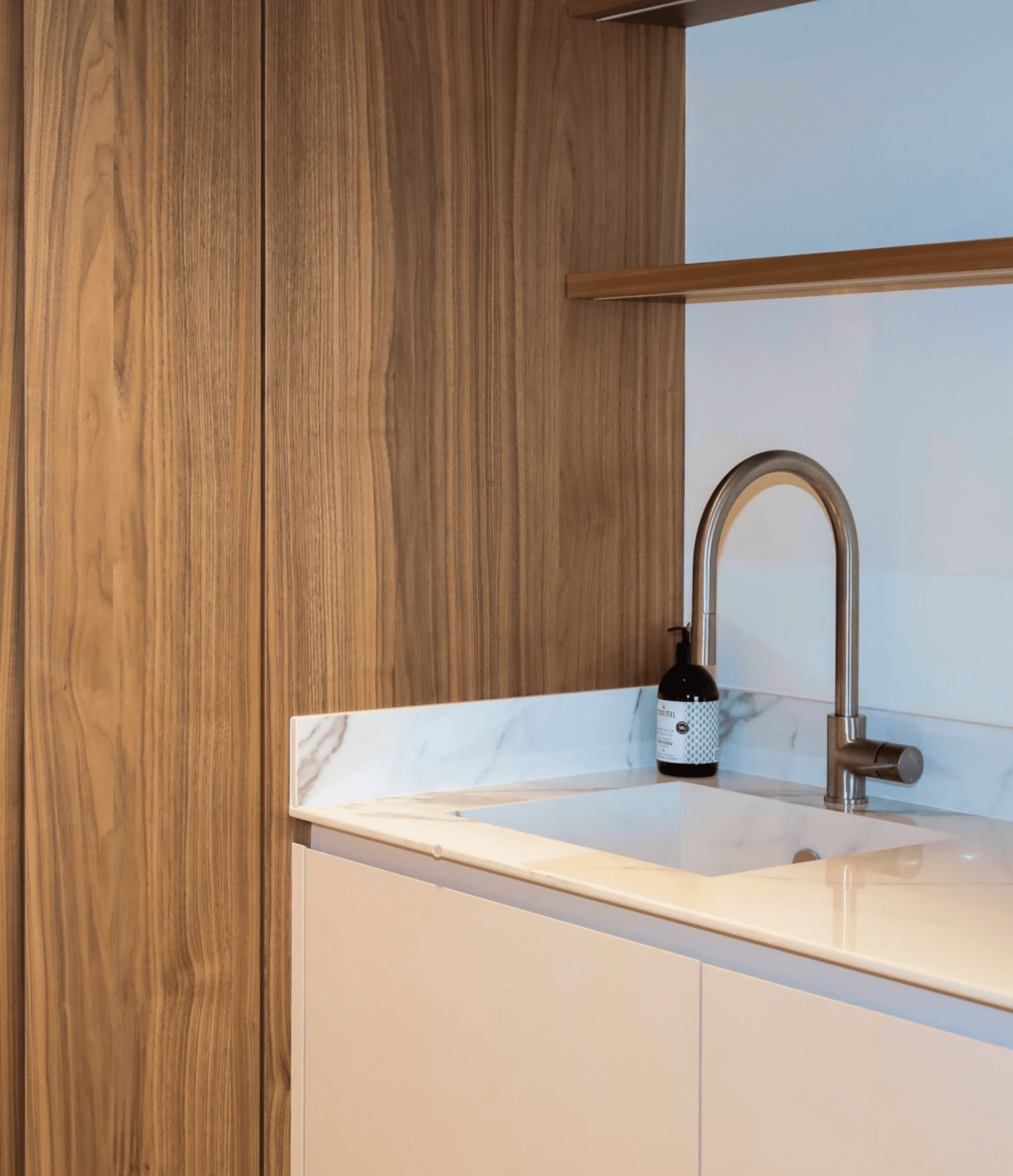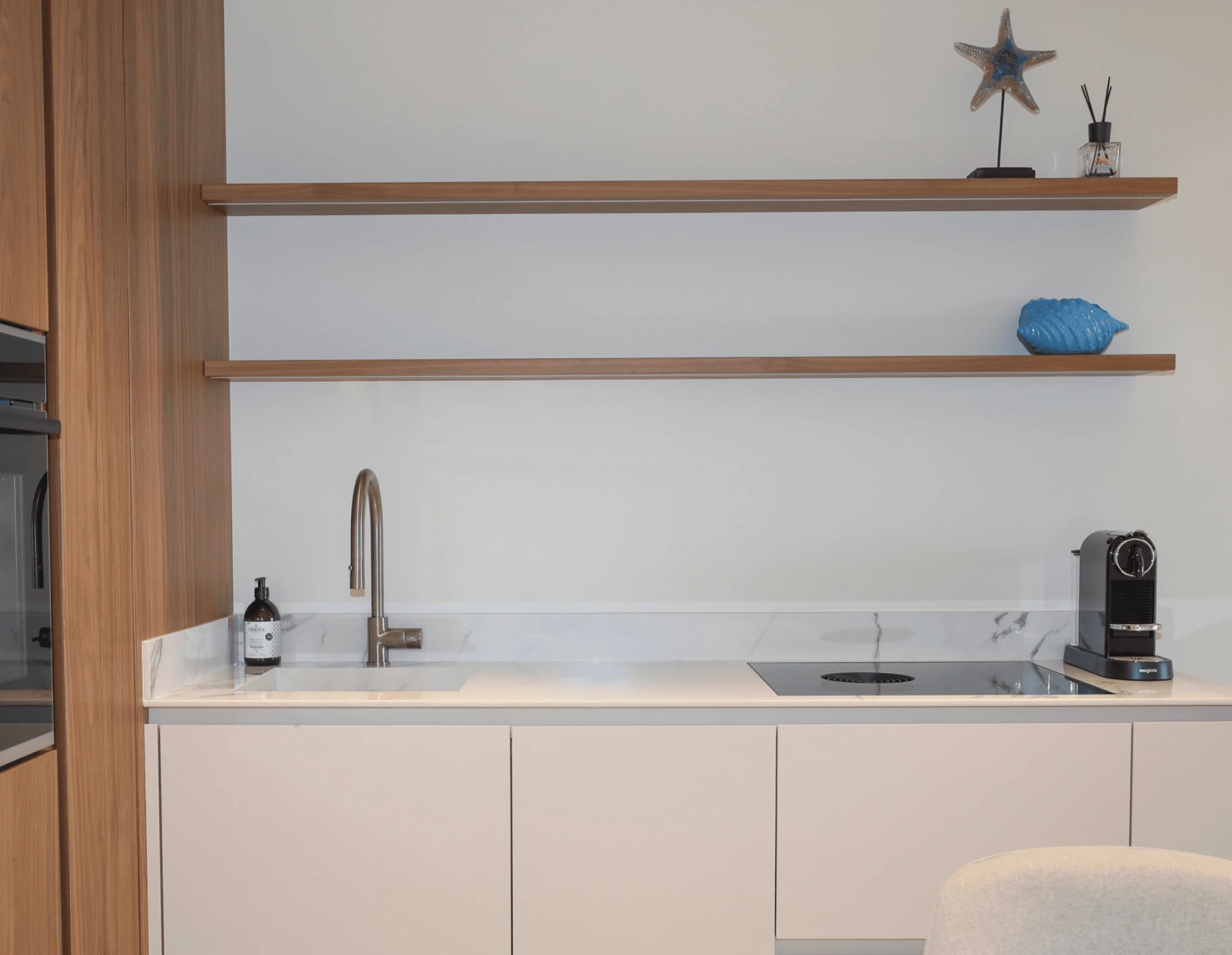 Petite par la taille mais grande par le style, cette cuisine sur-mesure prouve que l’ergonomie et le raffinement peuvent cohabiter. Chaque détail a été pensé pour optimiser l’espace, tout en offrant une atmosphère chaleureuse et élégante.
