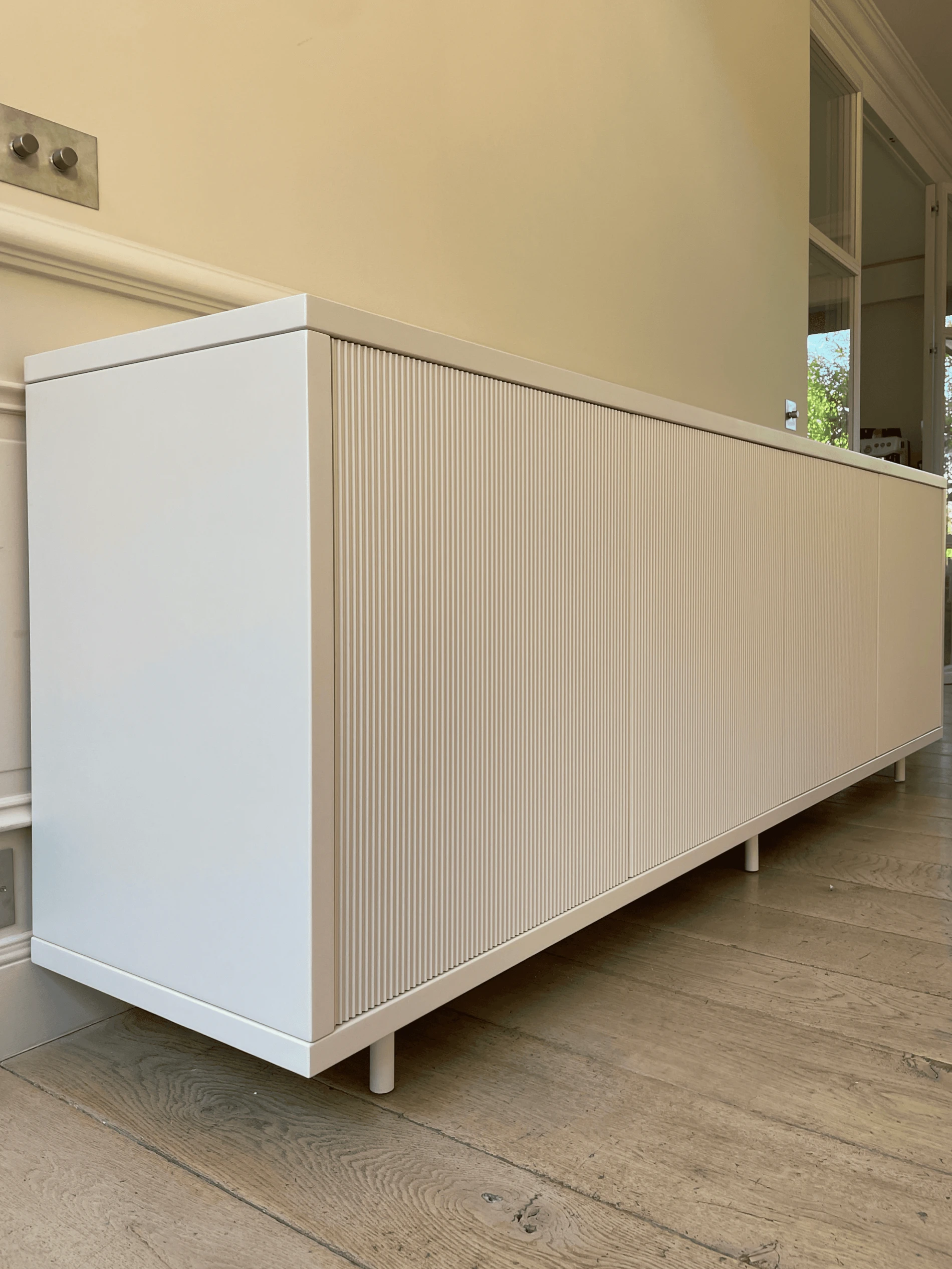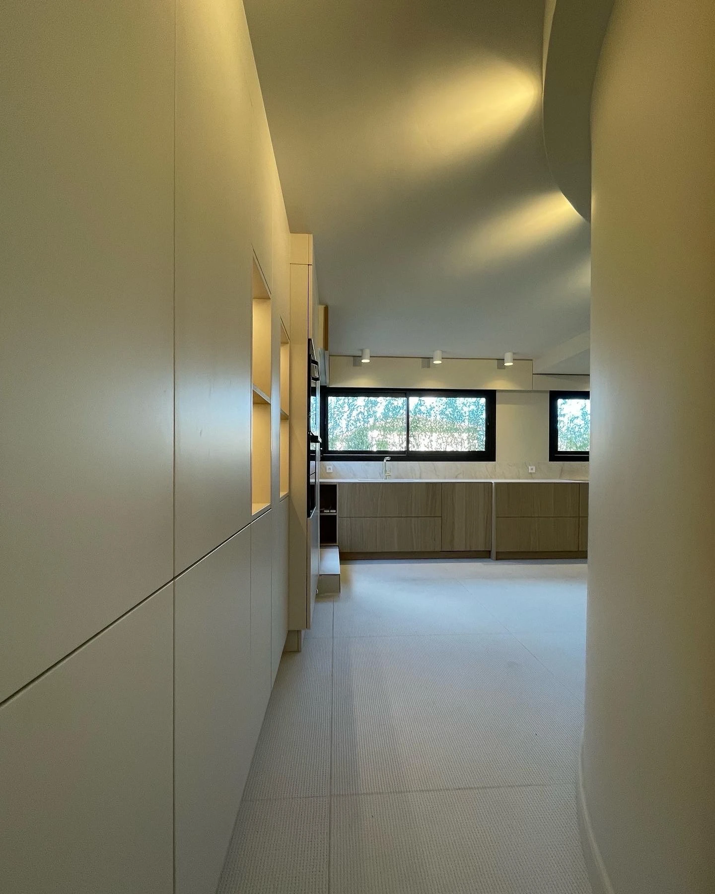 Les murs crème aux reflets chauds et le plafond blanc ponctué de spots encastrés mettent en valeur la luminosité et renforcent l’harmonie des volumes. Côté salon, un meuble sur-mesure en laque Disenio 153 complète l’aménagement : façades striées et contours lisses créent un rythme subtil qui affirme l’identité de la pièce sans l’alourdir.
