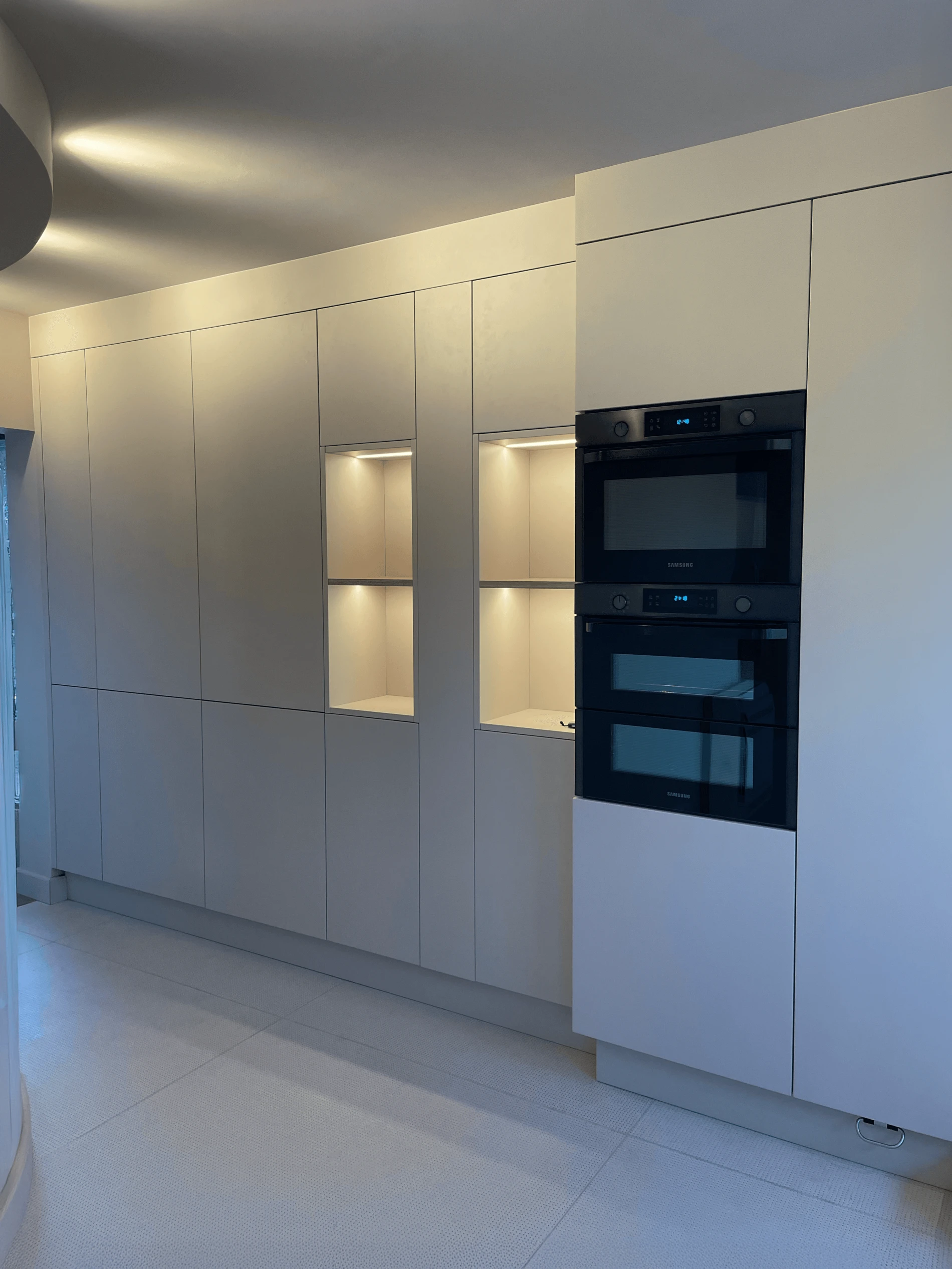 Le linéaire principal s’étend avec fluidité sur toute la longueur du mur, intégrant la plaque chauffante de manière discrète et un mitigeur en laiton placé près de la baie, apportant une signature subtile à l’ensemble. Au fond, un linéaire de colonnes niché dans le mur optimise l’espace et accueille fours et niches rétro-éclairées dans une finition Burdungy crème, alliant discrétion et fonctionnalité.