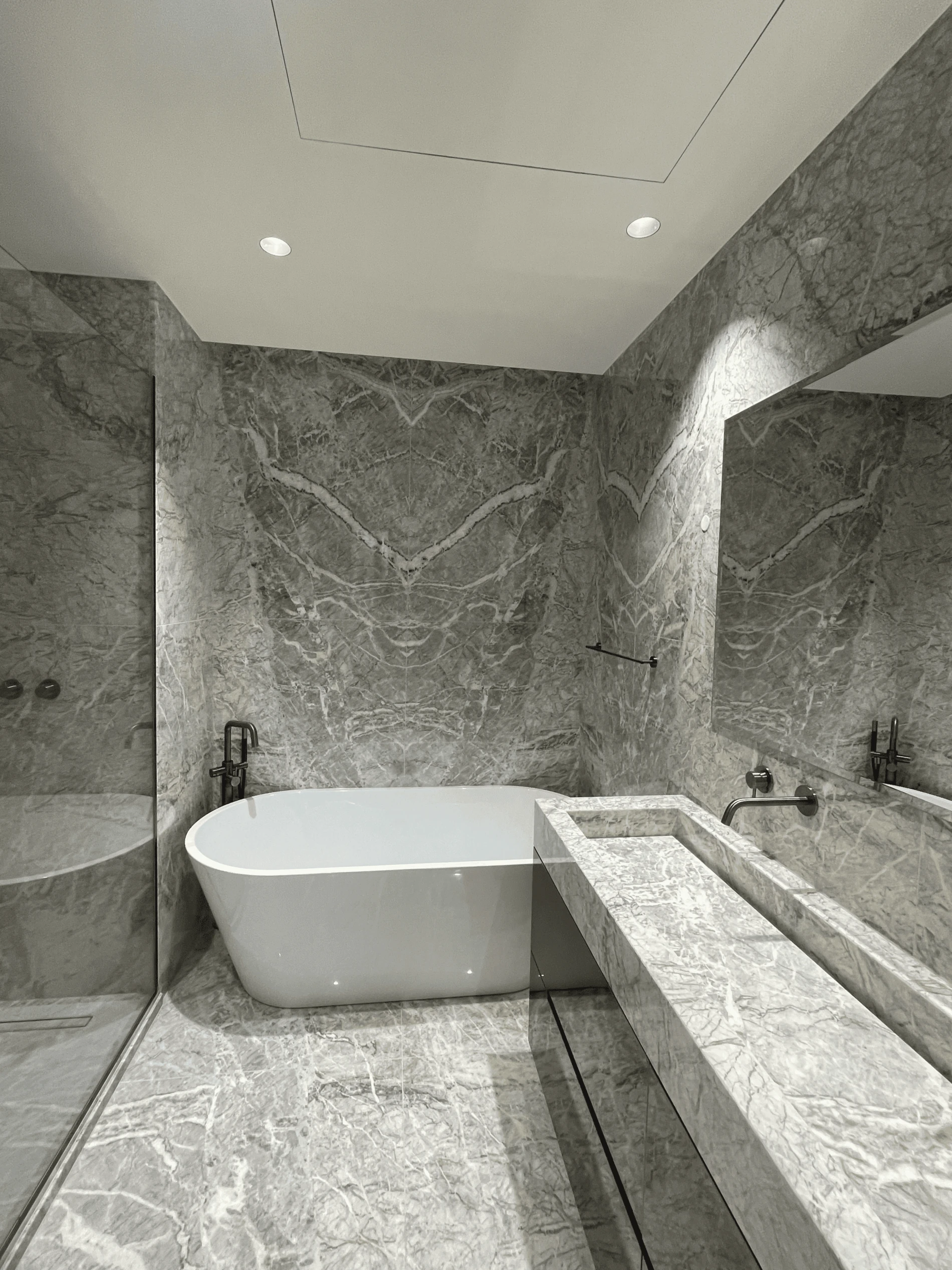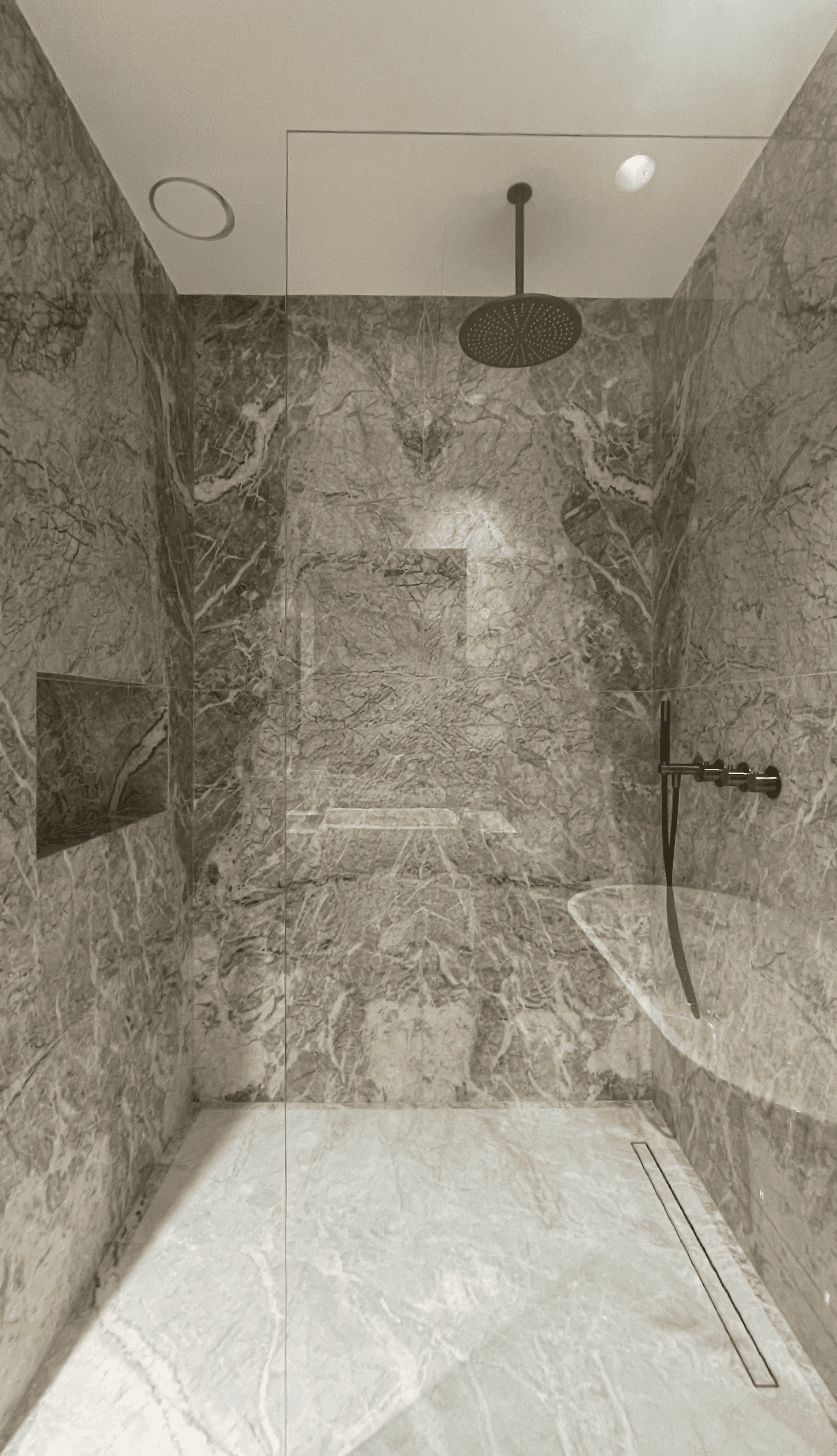 La salle de bain s’impose comme un écrin où l’épure rencontre les matières nobles. Les murs, habillés de marbre blanc veiné de gris, instaurent une atmosphère à la fois lumineuse et intemporelle.