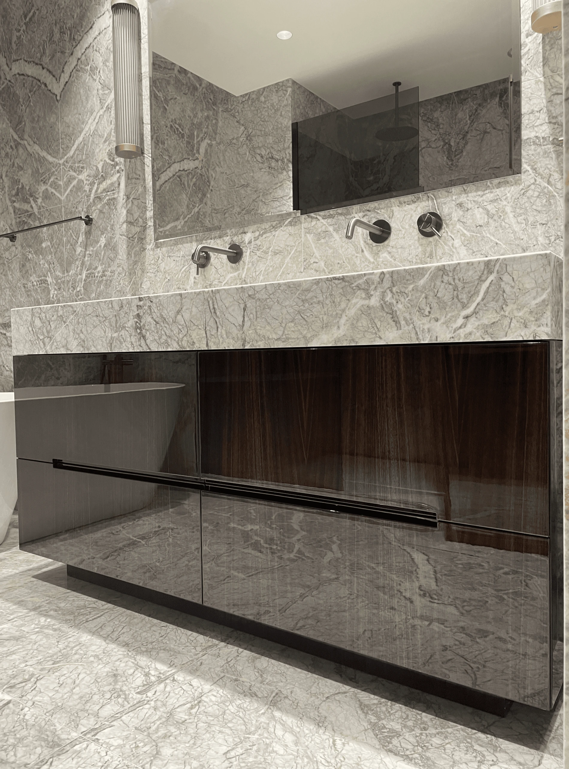 Une salle de bain pensée comme un manifeste d’élégance : marbre veiné, bois précieux et détails graphiques se rencontrent pour créer un lieu à la fois épuré, raffiné et profondément intemporel.