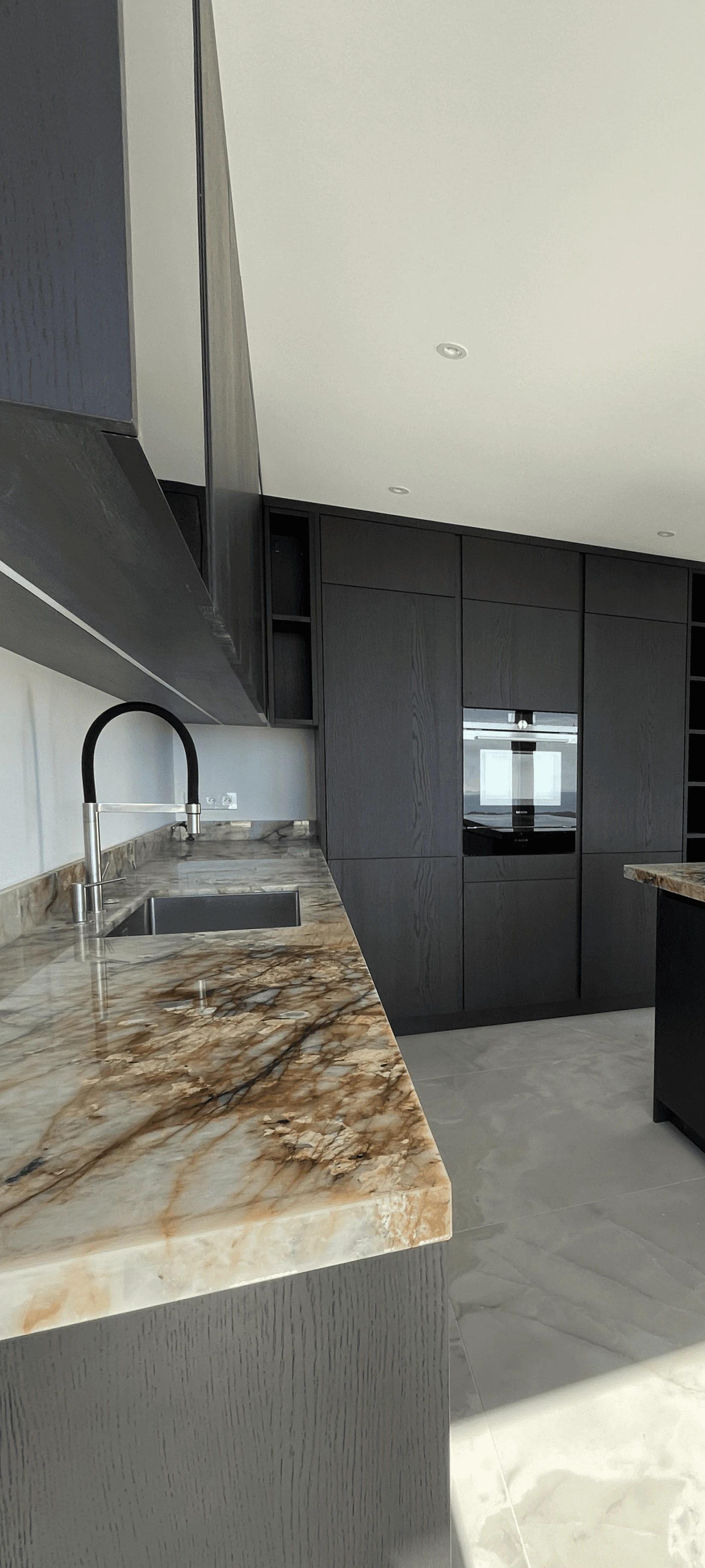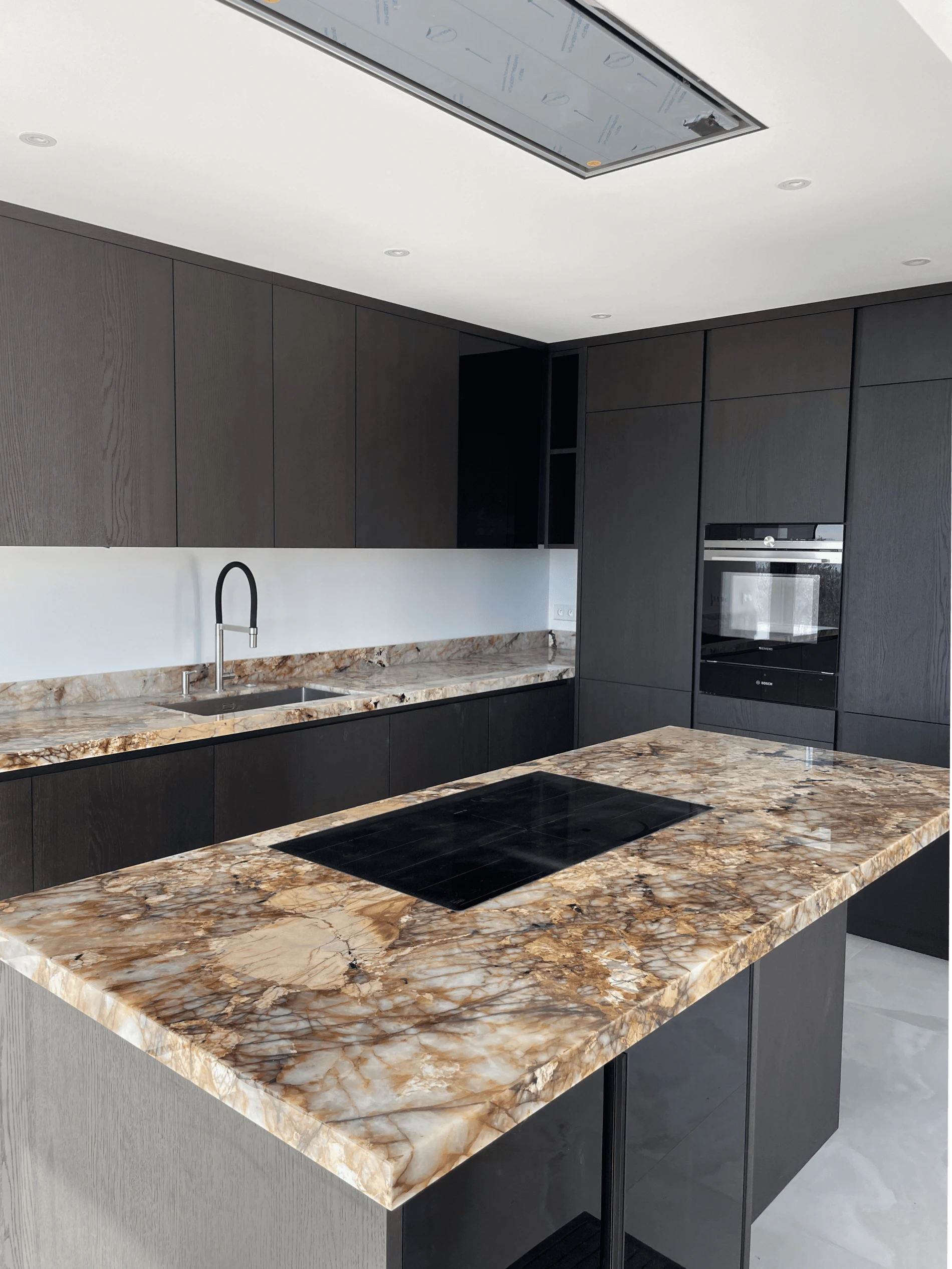 Cette cuisine en L avec îlot central se distingue par son caractère affirmé et sa maîtrise des contrastes. Les façades en chêne noir rencontrent un plan de travail en marbre jaune veiné de nuances grises, noires et orangées, créant un équilibre entre matière brute et sophistication contemporaine. La lumière naturelle qui traverse l’espace accentue cette dualité et met en valeur la profondeur des textures.