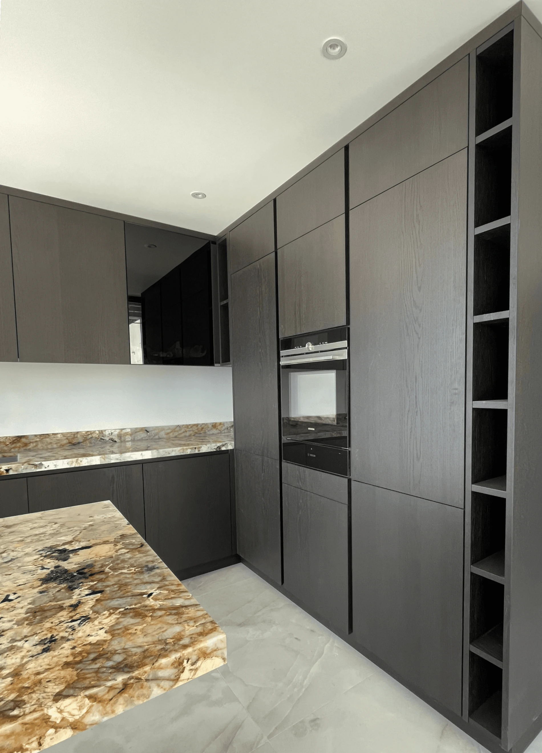 Baignée de lumière naturelle, cette cuisine en L avec îlot central impose son caractère avec raffinement. Les contrastes entre bois noir et marbre veiné créent une harmonie subtile, où chaque détail contribue à une atmosphère à la fois chaleureuse, lumineuse et pleine d’assurance.